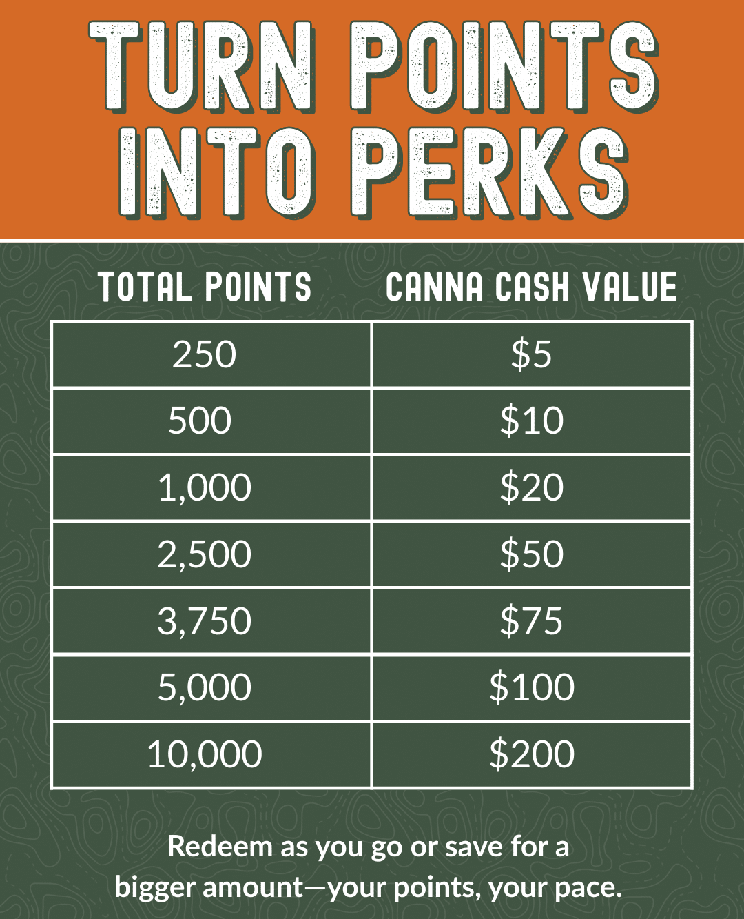 Customers must be enrolled in the Loyalty Rewards Program prior to the time of purchase to be eligible to earn points on that purchase. Points will not be awarded retroactively for purchases made before enrollment. Loyalty points may take up to 24 hours to appear in the customer’s rewards wallet following a qualifying purchase. Points are calculated based on the pre-tax amount spent. Loyalty Rewards cannot be stacked with other discounts or combined within the same transaction. Points, Rewards, and Canna Cash vouchers have no cash value, are non-transferable, and may not be exchanged for cash or store credit. Points are not earned on the purchase of gift cards.