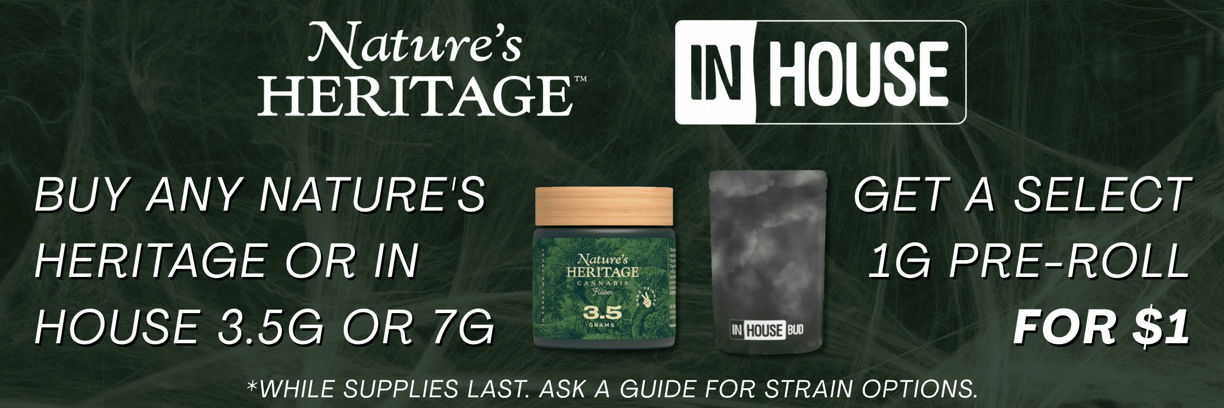 -Buy Any Nature’s Heritage or InHouse 3.5g or 7g, Get a Select Pre-Roll for $1 (ask a Guide for options)