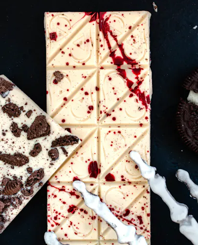 A delicious combo of crunchy chocolate cookie bits and smooth white creamy chocolate with a splatter of red cocoa butter.