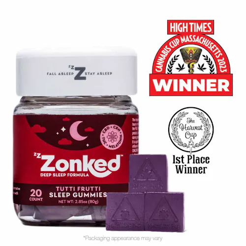 Zzzonked Sleepy Tutti Frutti Gummies **Allergens: Contains Tree Nuts. Production Facility Contains: Tree Nuts, Soy, Milk, and Wheat.** Sleep like a log tonight with Zzzonked Edibles, the all-new super sedating collection of gummies. Made with a natural blend of melatonin and full-spectrum cannabinoids: CBN, CBD, and THC, it's the perfect recipe for a good night's sleep. Zzzonked can help you fall asleep faster, deeper and regulate your sleep cycle for a more replenishing rest. Eat one piece an hour before going to bed, and relax. Onset effects may take up to one hour to begin; effects may include calmness, drowsiness, and sedation. TUTTI FRUTTI: Corn Syrup, Sucrose, Water, Gelatin, Dextrose, Sorbitol, Citric Acid, Tutti Frutti Flavoring, Cannabis Extract Oil, MCT Oil (Tree Nuts), Purple Food Coloring, Potassium Sorbate, Melatonin, CBD Isolate, CBN Isolate