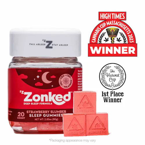Zzzonked Strawberry Slumber Sleepy Gummies **Allergens: Contains Tree Nuts. Production Facility Contains: Tree Nuts, Soy, Milk, and Wheat.** Sleep like a log tonight with Zzzonked Edibles, the all-new super sedating collection of gummies. Made with a natural blend of melatonin and full-spectrum cannabinoids: CBN, CBD, and THC, it's the perfect recipe for a good night's sleep. Zzzonked can help you fall asleep faster, deeper and regulate your sleep cycle for a more replenishing rest. Eat one piece an hour before going to bed, and relax. Onset effects may take up to one hour to begin; effects may include calmness, drowsiness, and sedation. STRAWBERRY SLUMBER: Corn Syrup, Sucrose, Water, Gelatin, Dextrose, Sorbitol, Citric Acid, Strawberry Flavoring, Guava Flavoring, Cannabis Extract Oil, MCT Oil (Tree Nuts), Red Food Coloring, Potassium Sorbate, Melatonin, CBD Isolate, CBN Isolate